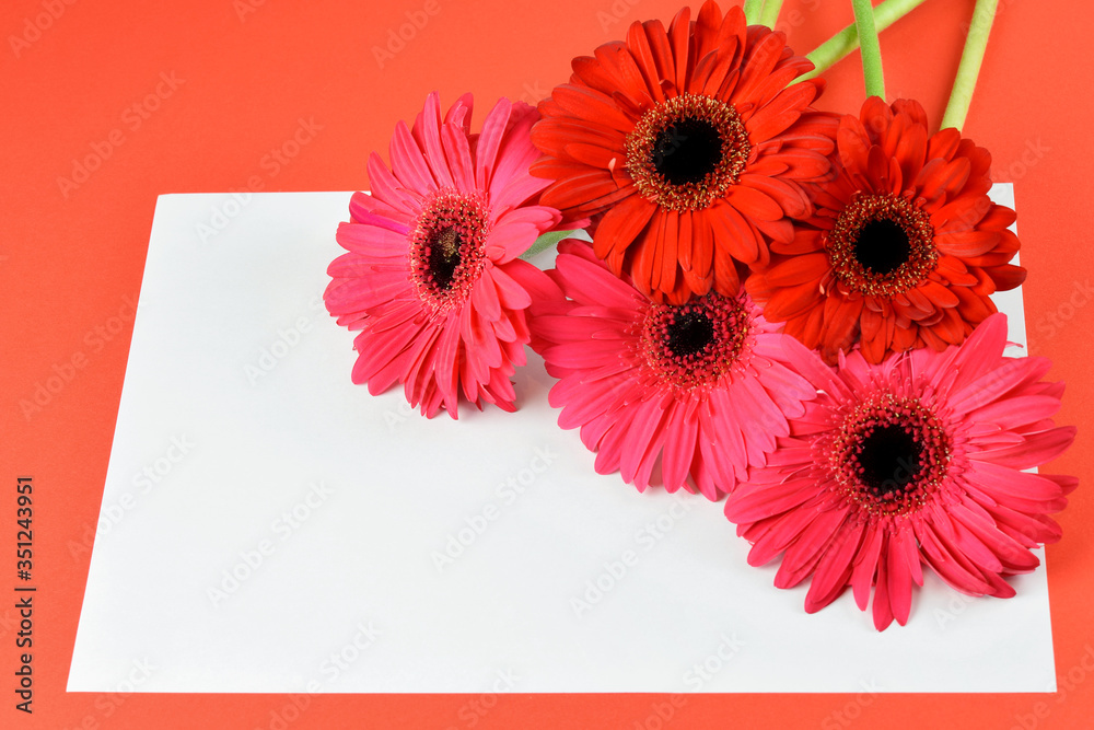 Bouquet gerbera flowers on the white piece of paper. Red background, with a space for your text. Springtime, gardening concept.