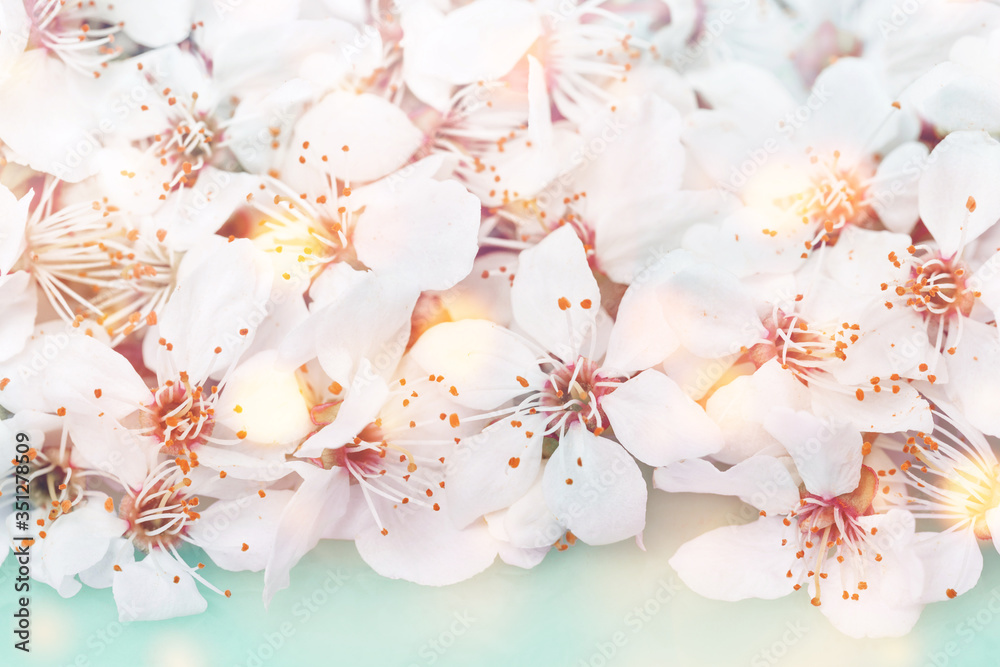 Spring summer festive blooming with white flowers fruit tree branches macro on baby aqua blue with sun flares. Fresh floral greeting card background with copy space
