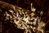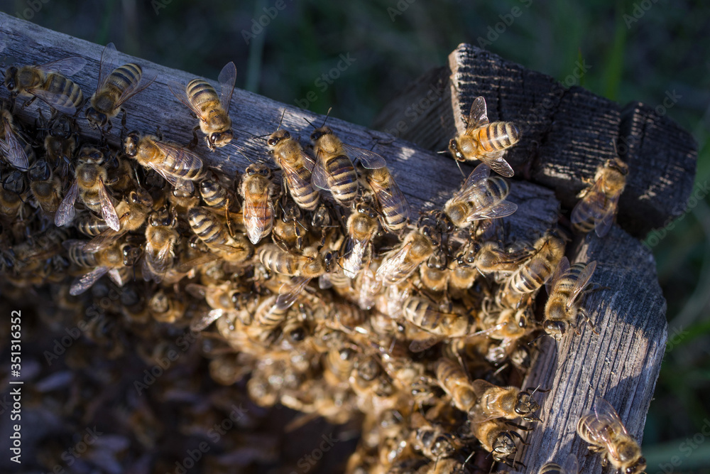 A colony of bees near the hive, soft focus. Swarm of bees. Beekeeping