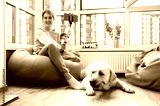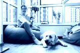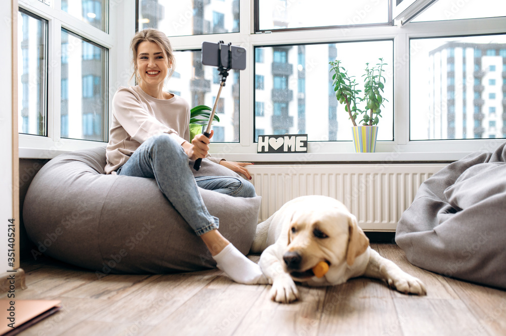 Live broadcast. Attractive young girl blogger went live broadcast to chatting online with her subscribers. She holds a phone and a selfie stick in her hand. Blogger lifestyle. Next to her is her pet