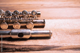 Close up transverse flute on wooden background. Classical music concept. Funk culture and music concept. topical orchestra and melody. Copy space