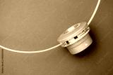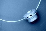 New metal reel for a lawn mower with a plastic yellow line on a dark background.
