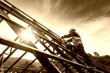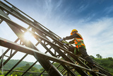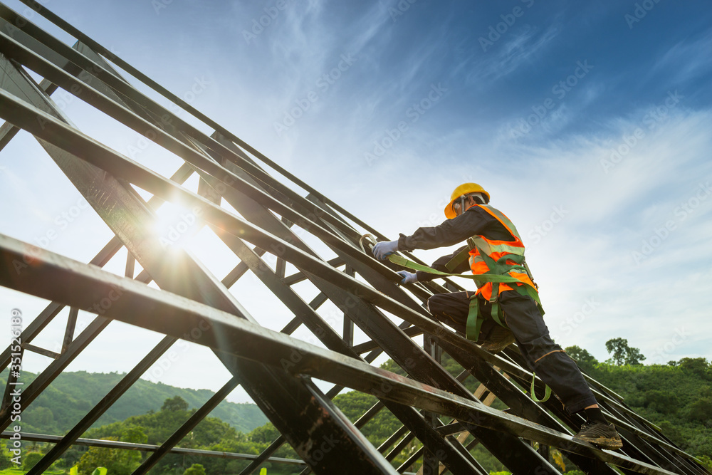 Safety body construction, Working at height equipment. Fall arrestor device for worker with hooks for safety body harness on the roof structure