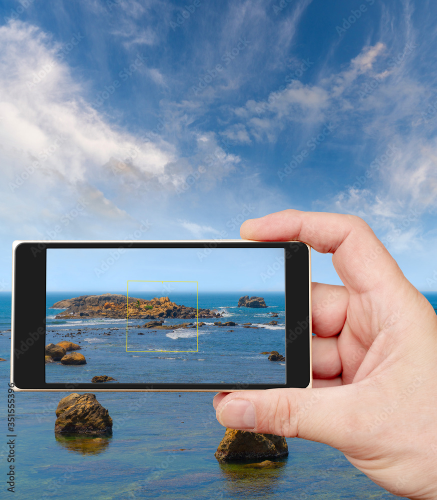 Blue ocean on smartphone screen. Rocks on the ocean.