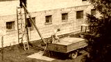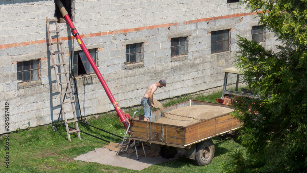 Grain workers on the old tractor trailer. Sprinkling grain.