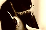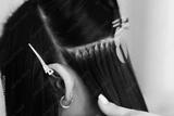 The hairdresser does hair extensions to a young girl in a beauty salon. Professional hair care. Close up of capsules and strands of grown hair