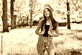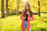Outdoor portrait of beautiful young woman with brown hair, relaxing in nature