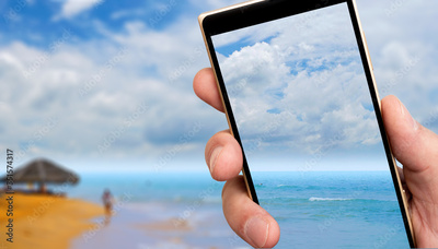 Sandy ocean beach on smartphone screen. Sunny day in tropics.