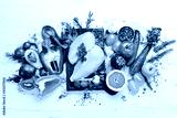 Healthy food background. Fresh vegetables, fruits and chicken meat. Free space for your text. Rustic style.