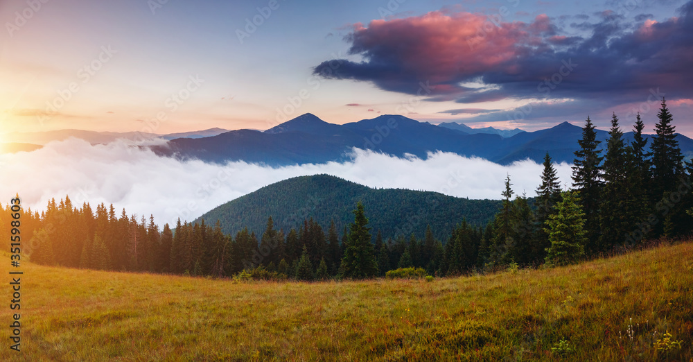 Morning panorama of misty mountains. Location place of Carpathians mountains, Ukraine.
