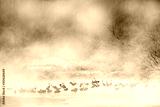 Wildlife scene, snowy nature. Bridge Cranes. Otowa winter Japan with snow. Birds in river with fog. Hokkaido, cold Japan. Red-crowned cranes in the water.
