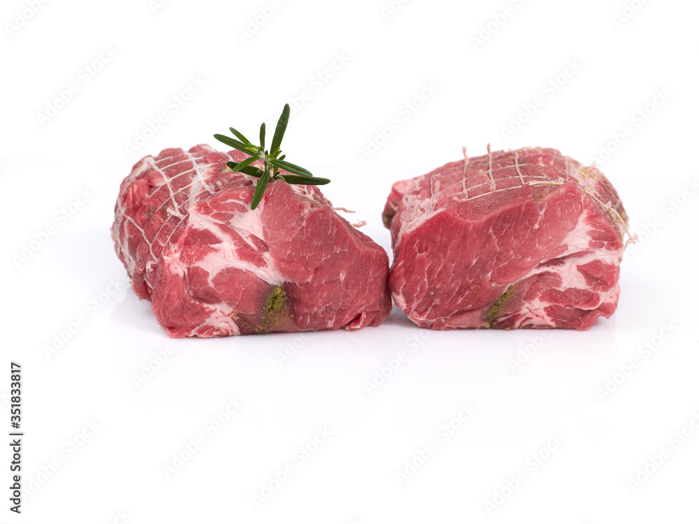 deux rôtis porc crus farcis aux fines herbes isolé sur fond blanc