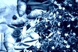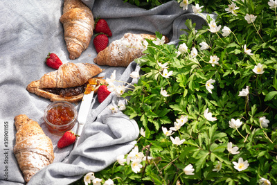 Сroissants, strawberries and jam. Summer picnic on a sunny day. Breakfast on green grass in the garden with white spring flowers blossom. Eating food outdoor. Spreading jam. Copy space, close up