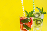Infused water or lemonade with strawberry, kiwi, ice and mint in the two glasses on the yellow background. Closeup. Copy space.