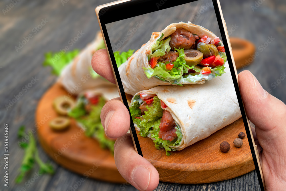Fresh rolls with vegetables and meat on smartphone screen. Cooking food.