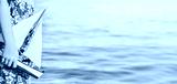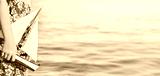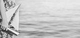 Child Caucasian tanned boy in swimming trunks at the seaside beach holding toy sailing boat. Blue sunny waters. Exotic travel and destination scenic vacation web banner with copy space