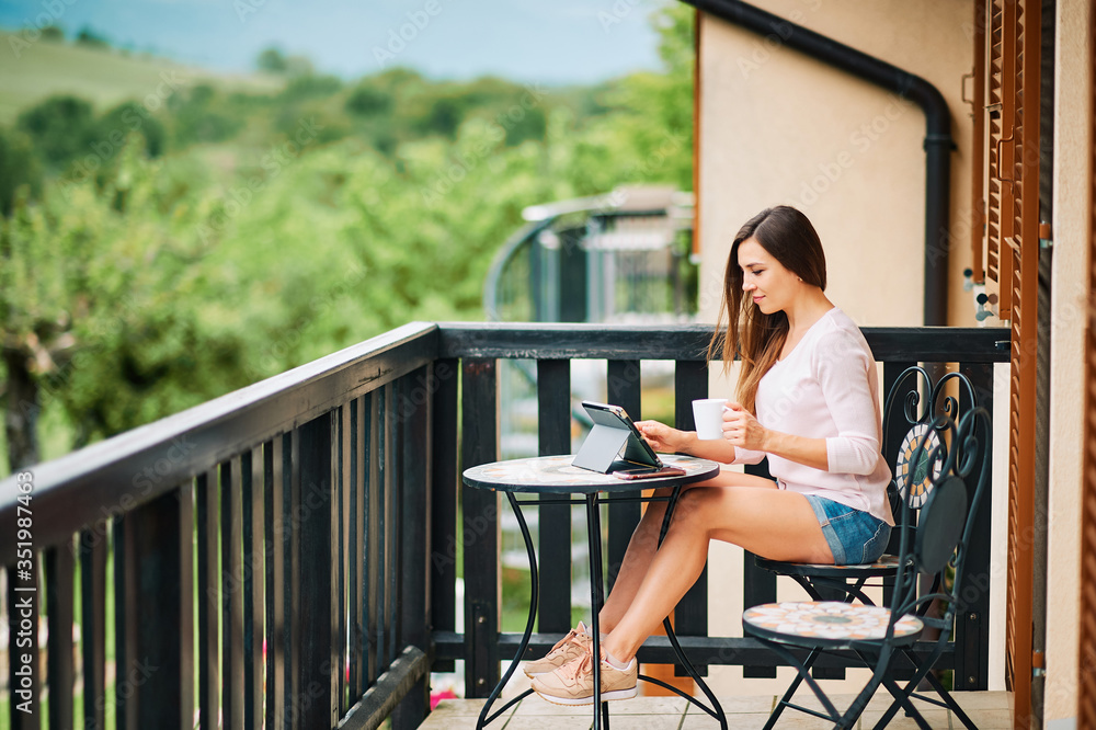 Young woman working from home on the balcony, using tablet pc, holding cup of coffee