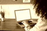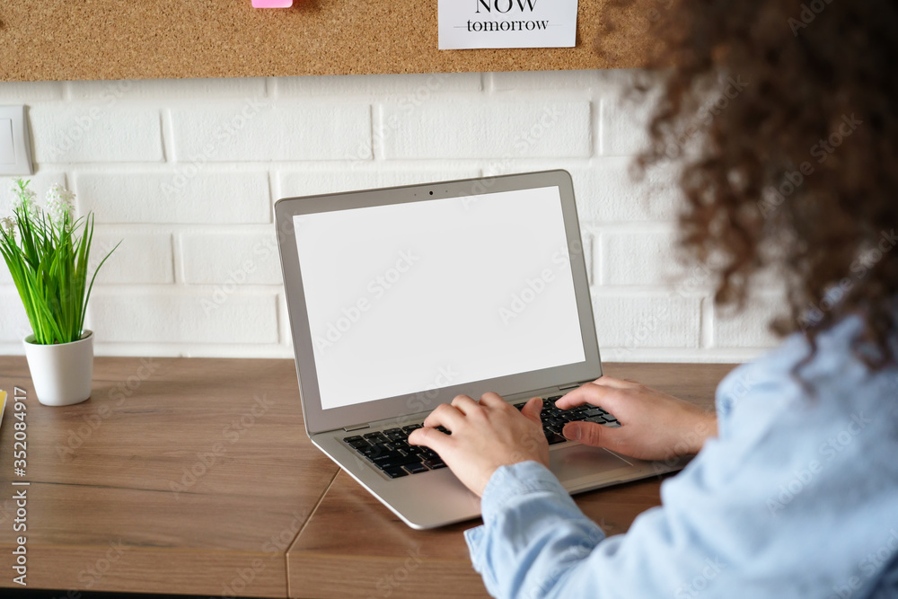 African american young woman student worker elearning working online from home office typing on laptop computer mock up white blank screen. Web education concept. Close up over shoulder back view.