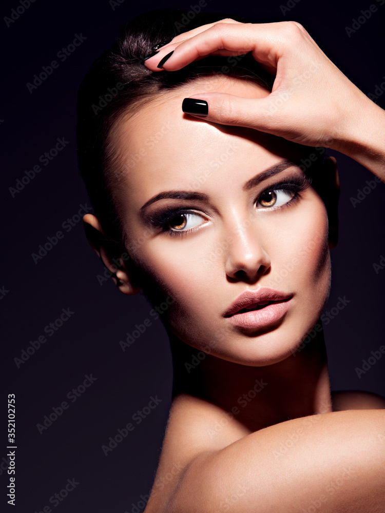 Close-up face of a beautiful sexy woman with brown make-up of eyes