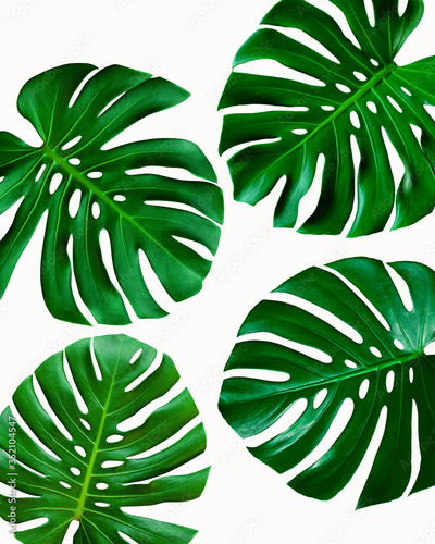 tropical monstera leaves nature frame on white background, nature flat lay concept