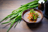 Chicken curry in a bowl on wooden table background. Spicy yellow Tikka Masala with fresh vegetables on top. Asian restaurant menu. Close up, copy space