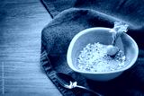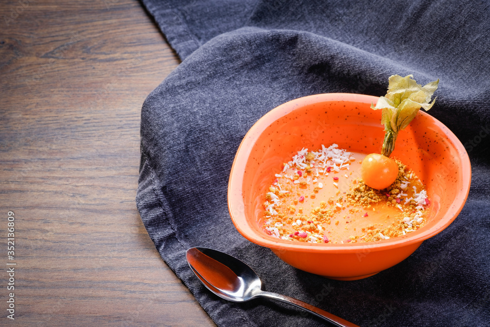 Sea buckthorn dessert in orange bowl on wooden table background with denim tablecloth. Decorated, delicious vegetarian raw dessert mousse with physalis. Restaurant menu. Copy space, close up
