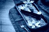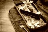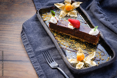 Slice of chocolate tart cake served on a plate on a wooden table background. Beautiful, delicious biscuit dessert with cream, strawberries and physalis. Restaurant menu. Copy space, close up