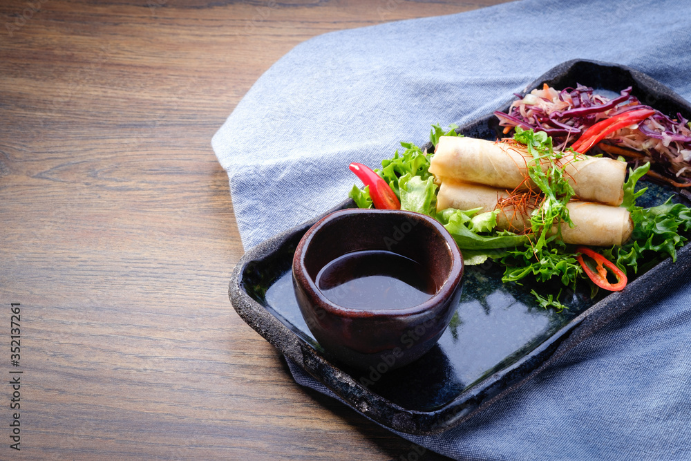 Fried spring rolls on black plate on wooden table background. Traditional asian spring rolls with crispy chicken, salad garnish, vegetables and sweet chili sauce. Restaurant menu. Close up, copy space