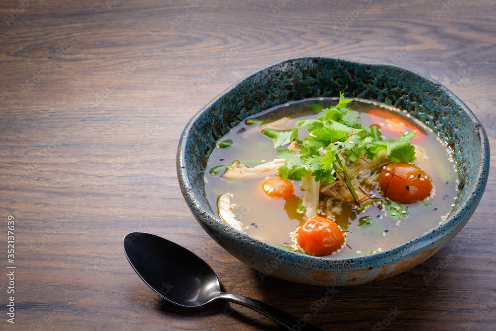 Tom Yum soup in a bowl on wooden table background. Traditional thai asian spicy soup with seafood and vegetables. Restaurant menu. Close up, copy space