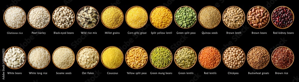 Big set of legumes and cereals in wooden bowls isolated on black. Food background, header, banner. Top view
