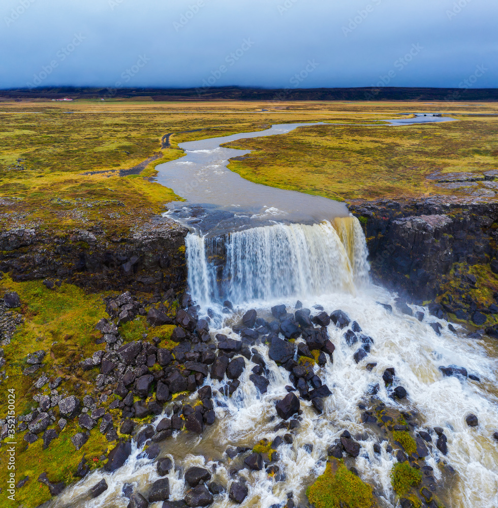 Aerial view of the Oxarafoss waterfalls in Iceland