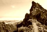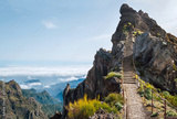 "Stairs to heaven" - Breathtaking view at famous mountain footpath from Pico do Arieiro to Pico Ruivo on the Portuguese Madeira island. Trekking Around the world traveling with kids concept image.