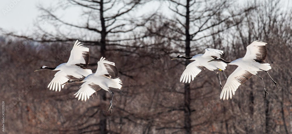 Group of Japanese cranes in flight. Japan. Hokkaido. Tsurui.