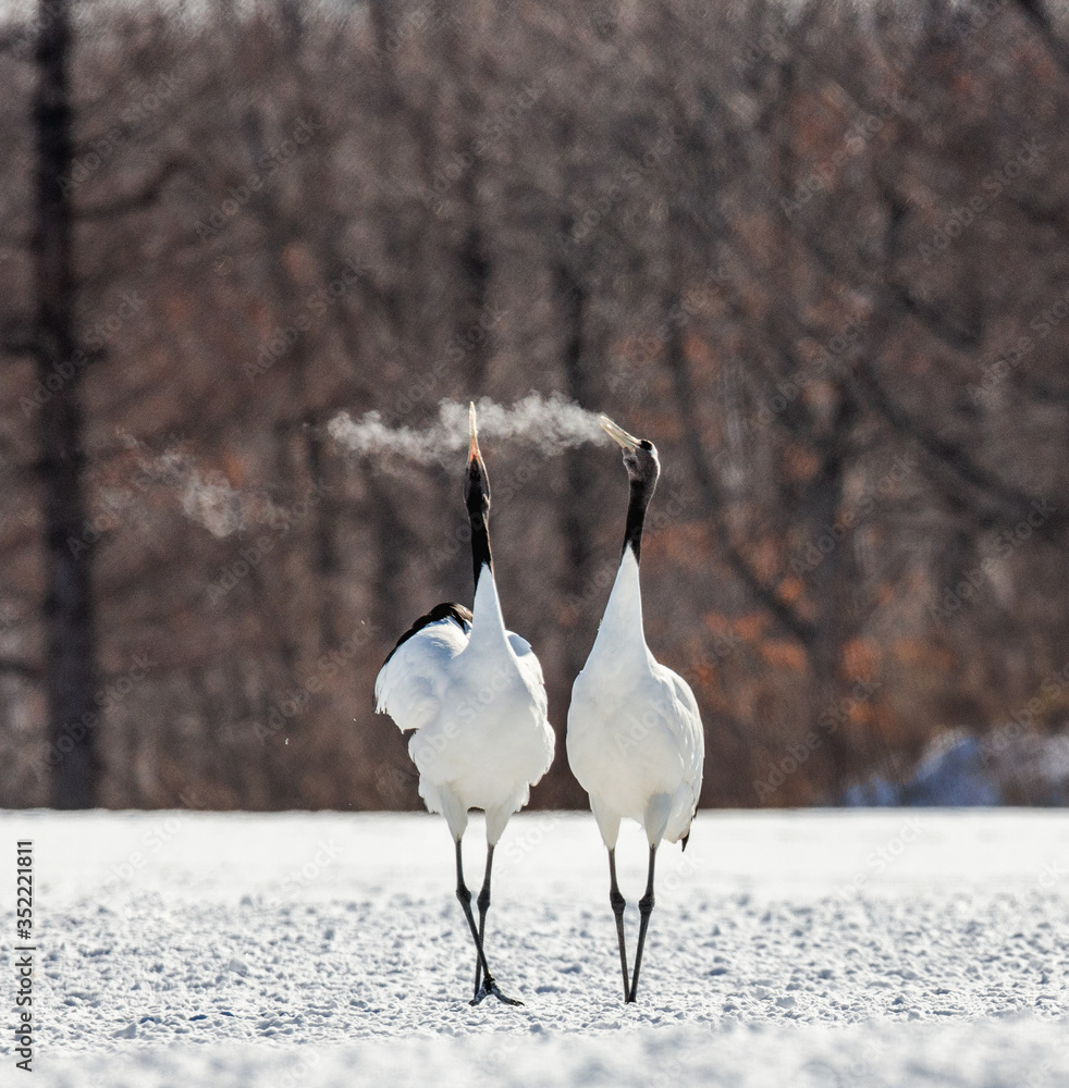 Two Japanese cranes are walking together in the snow and scream mating sounds. Frost. There is steam from the beaks. Japan. Hokkaido. Tsurui.