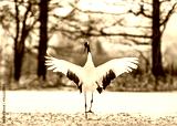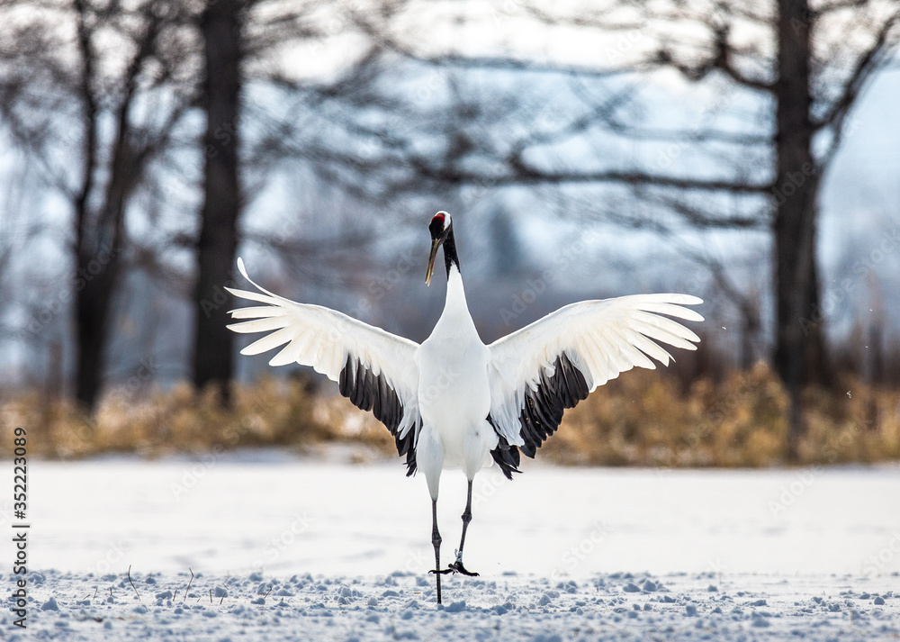 Japanese crane is standing in the snow and spread its wings. Japan. Hokkaido. Tsurui.