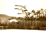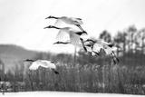 Group of Japanese cranes in flight. Japan. Hokkaido. Tsurui.