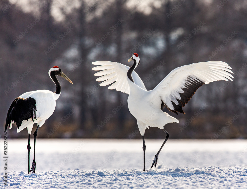 Two Japanese Cranes are dancing on the snow. Japan. Hokkaido. Tsurui.