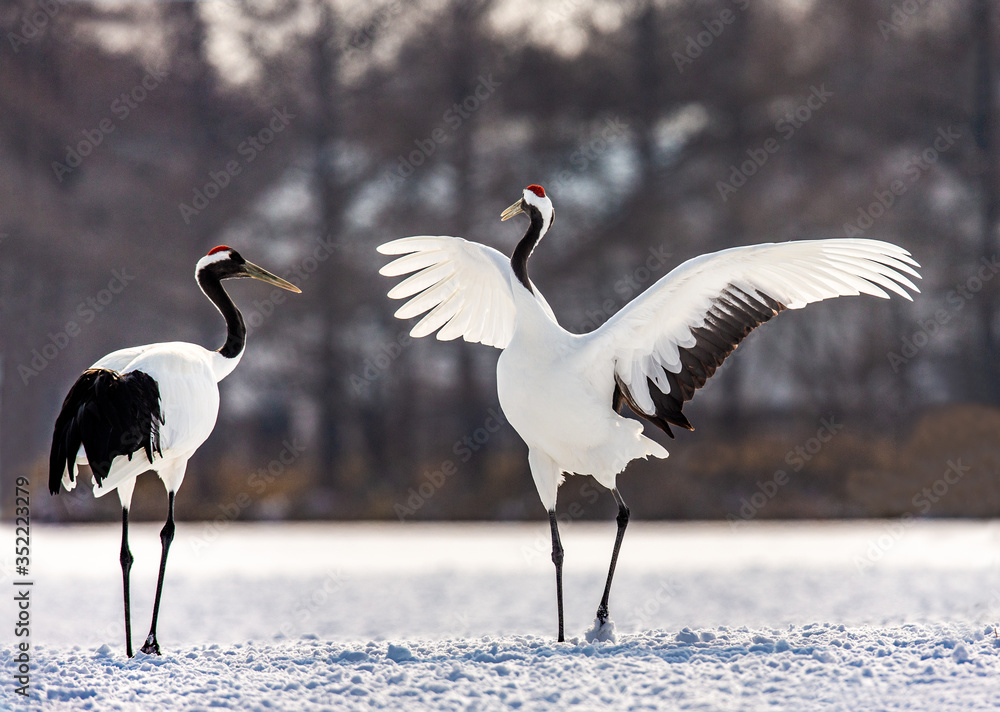 Two Japanese Cranes are dancing on the snow. Japan. Hokkaido. Tsurui.