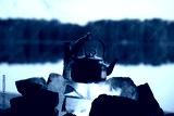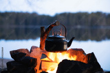 Vintage coffee pot on camping fire. Wonderful evening atmospheric background of campfire. Romantic warm place with fire. The concept of adventure, travel, tourism and camping.