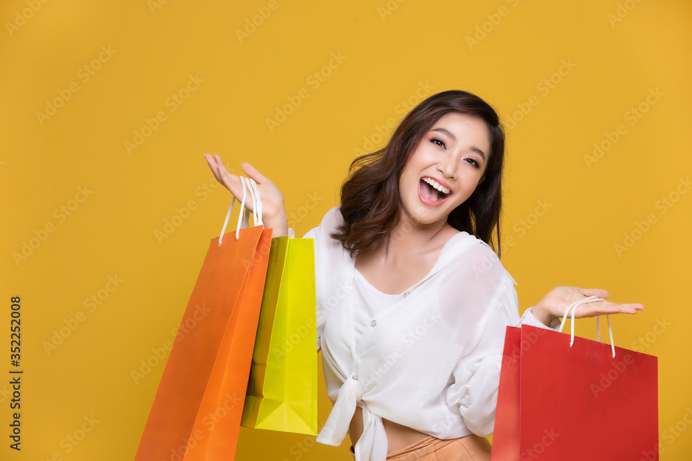 Portrait Asian beautiful happy young woman smiling cheerful and holding shopping bags on yellow background.Happiness, consumerism, sale and people shopping concept.