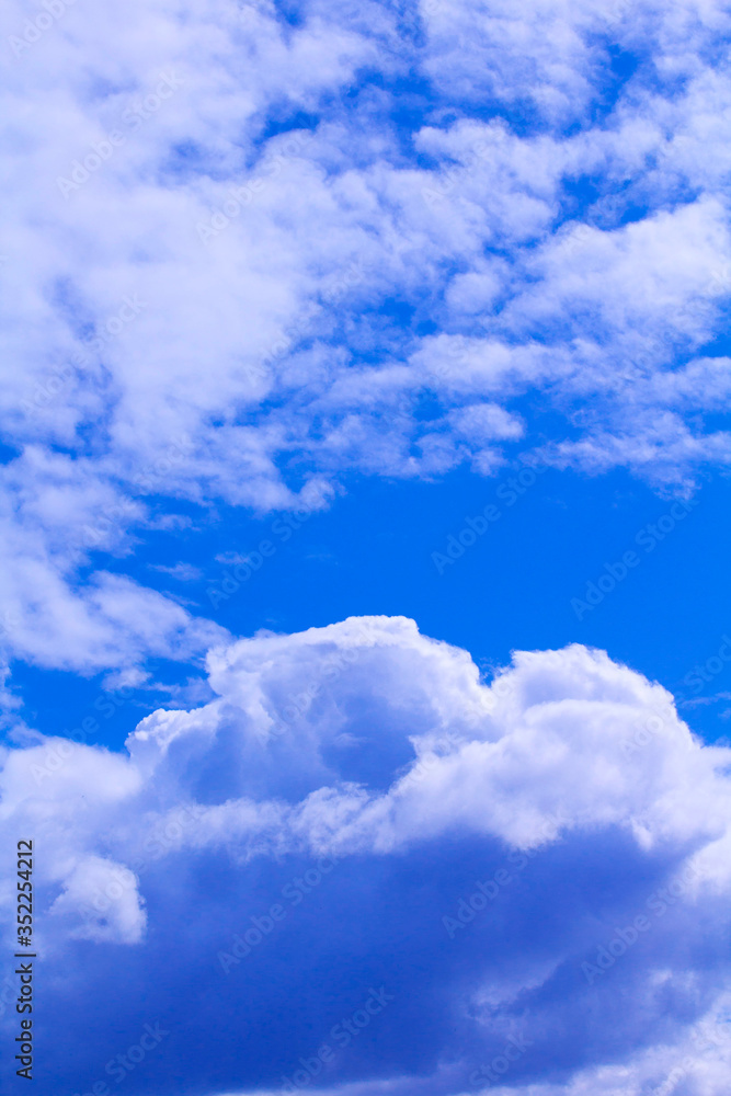Natural background. Blue sky with white clouds on the sunny day. Location vertical. Closeup.
