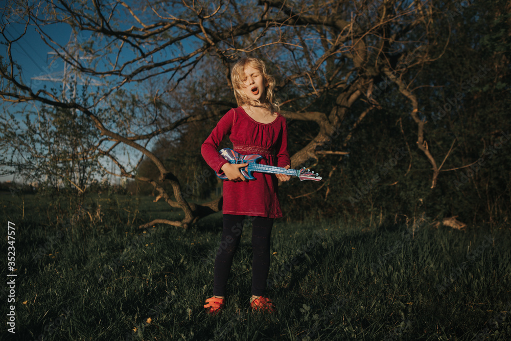 Cute adorable young girl playing guitar toy outdoor. Girl pretending to be a rock music star. Adorable funny child having fun in park. Weird funny hilarious authentic candid childhood moment.