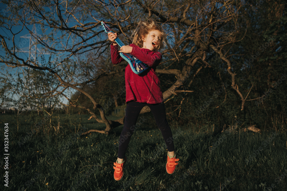 Cute adorable young girl playing guitar toy outdoor. Girl pretending to be a rock music star. Adorable funny child having fun in park. Weird funny hilarious authentic candid childhood moment.