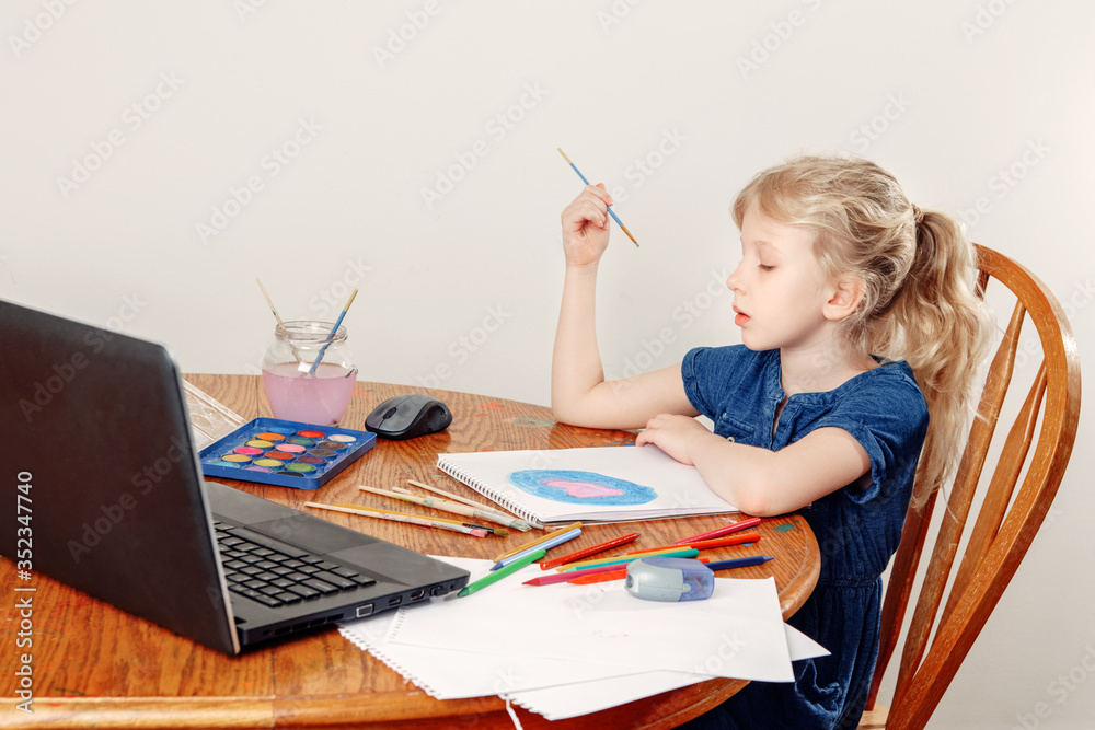 Girl child learning art lesson online on laptop Internet. Virtual drawing painting class on video during self-isolation at home. Distant remote video education. Modern homeschool study new normal.