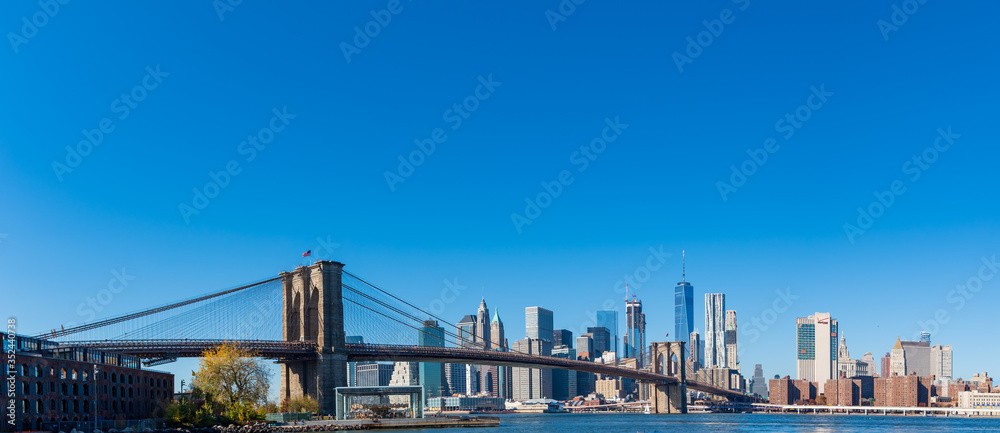 Wide panorama of skyscrapers in Manhattan with Brooklyn Bridge, New York at daytime