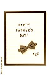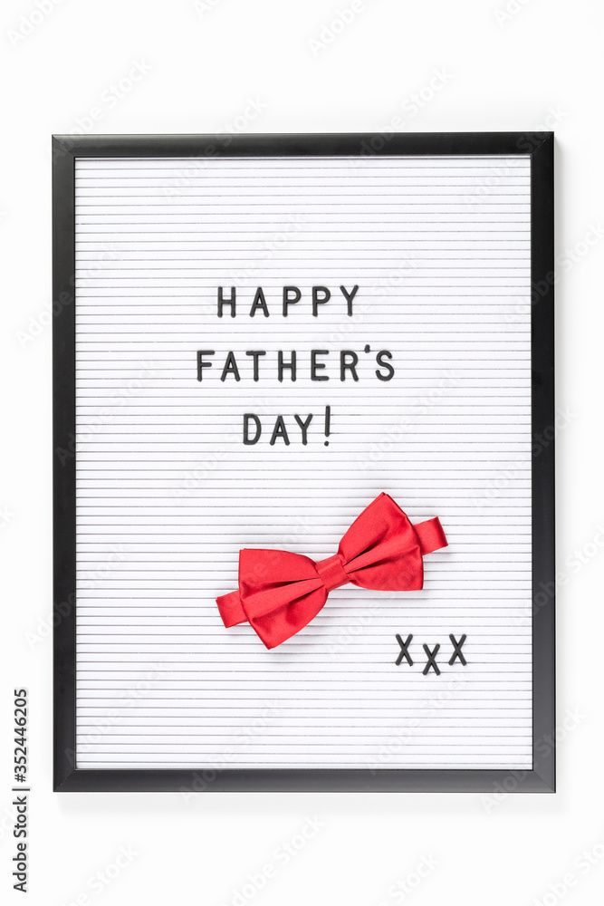 Happy Father's Day text on letter board with red bow tie and xxx. isolated on white. Minimal framed text poster or banner. Copy space. Sale mockup