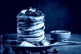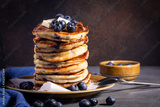 Homemade pancakes with ricotta and blueberries. Dark background.
