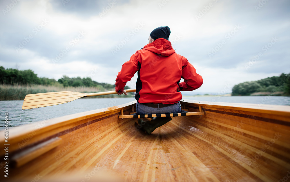 Rear view of man in red jacket paddling canoe on cloudy day. Active, adventure, outdoors, canoeing, kayaking
