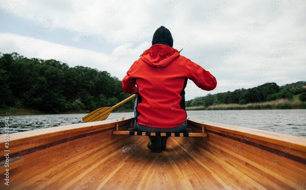 Low angle view of canoeist paddling boat. Man paddling canoe