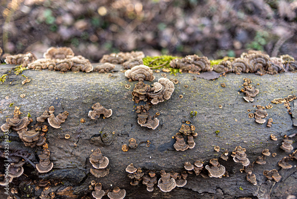 Moos und Pilze auf einem umgefallenen Baumstamm im Wald